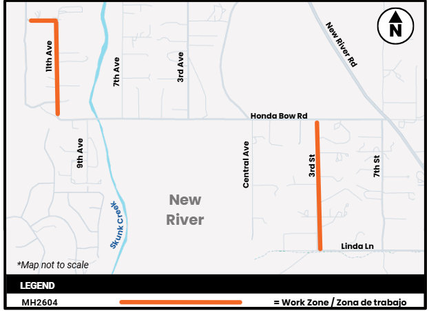 The Maricopa County Department of Transportation (MCDOT) will be performing pavement preservation work in the New River area to extend the life of the roadway, renew the surface, seal cracks, and protect the road from UV rays. MCDOT advises drivers to plan ahead for temporary daytime lane closures and possible delays in both directions on roads undergoing construction. Flagging operations will be in place to help direct traffic while work is underway. Construction begins on Monday, April 20, 2026 and continues through May 2026.