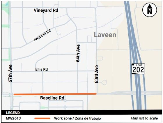 The Maricopa County Department of Transportation (MCDOT) will be performing maintenance work on drainage facilities on Baseline Road between 63rd and 67th avenues in Laveen beginning April 20, 2026. Workers will remove and replace headwalls on Baseline Road, and repair or replace pipes where necessary.