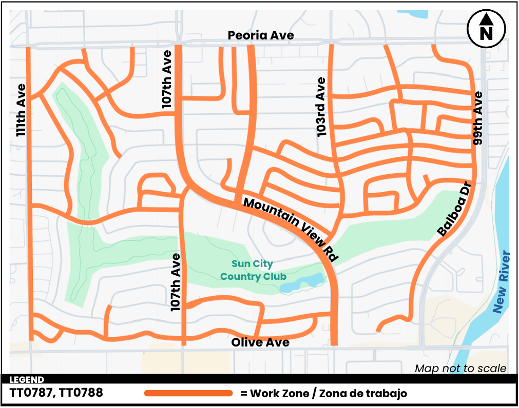 Beginning on Monday, April 6, 2026 the Maricopa County Department of Transportation (MCDOT) will be making Americans with Disabilities Act (ADA) improvements within county right-of-way in the Sun City area. The work will take place on select sidewalks between 111th, Peoria, 99th, and Olive avenues. The project includes upgrading ADA ramps, curbs and gutters, and installing sidewalk passing areas, when indicated. The work is expected to be done in phases based on location. Crews will move between each work zone, completing a section before moving to the next. Crews will provide door hangers to residents in affected areas as needed.