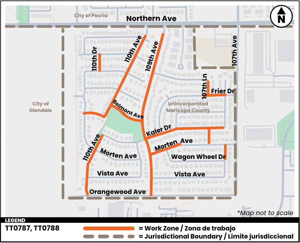 Beginning on Monday, April 20, 2026 the Maricopa County Department of Transportation (MCDOT) will be making Americans with Disabilities Act (ADA) improvements within county right-of-way in the Country Meadows area. The work will take place on select sidewalks between 111th, Northern, 107th, and Orangewood avenues. The project includes upgrading ADA ramps, curbs and gutters, and installing sidewalk passing areas, when indicated. The work is expected to be done in phases based on location. Crews will move between each work zone, completing a section before moving to the next. Crews will provide door hangers to residents in affected areas as needed.