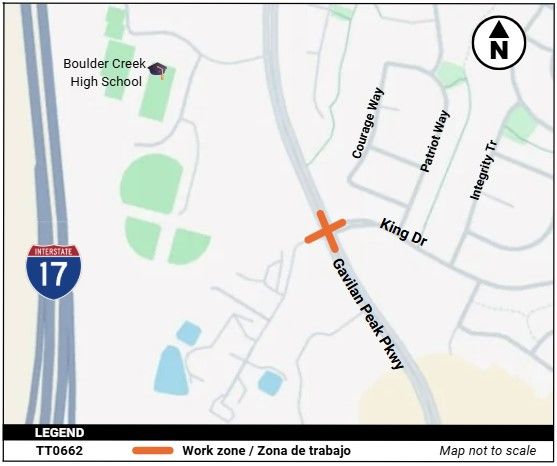 A new traffic signal and other improvements are planned to be constructed by the Maricopa County Department of Transportation (MCDOT) at the intersection of Gavilan Peak Parkway and King Drive in the Anthem area north of Phoenix. This project was initiated after traffic studies determined that the existing intersection needed to be upgraded to serve population growth and help traffic flow more smoothly on Gavilan Peak Parkway.
