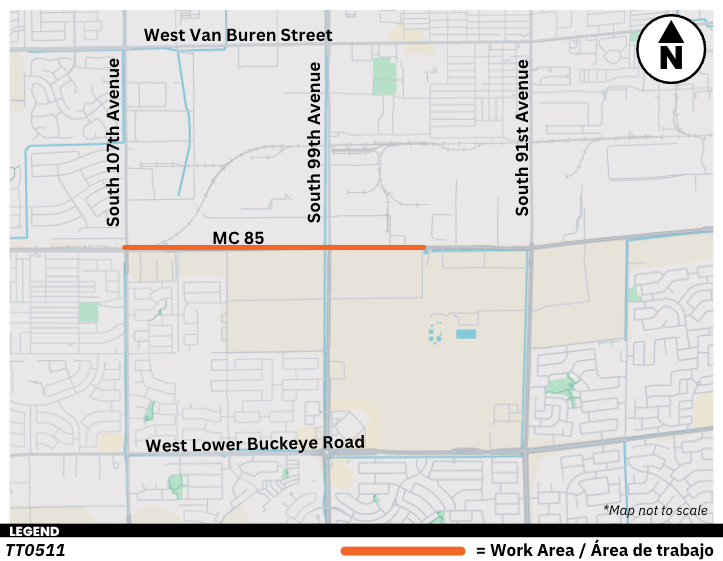 The Maricopa County Department of Transportation is designing a project to construct a five-lane arterial road from 107th Avenue to 95th Avenue on MC 85. The project will include the addition of a center turn lane, raised medians, improvements to sidewalks and the addition of street lighting. Drainage basins and traffic signals are also being upgraded within the project limits.